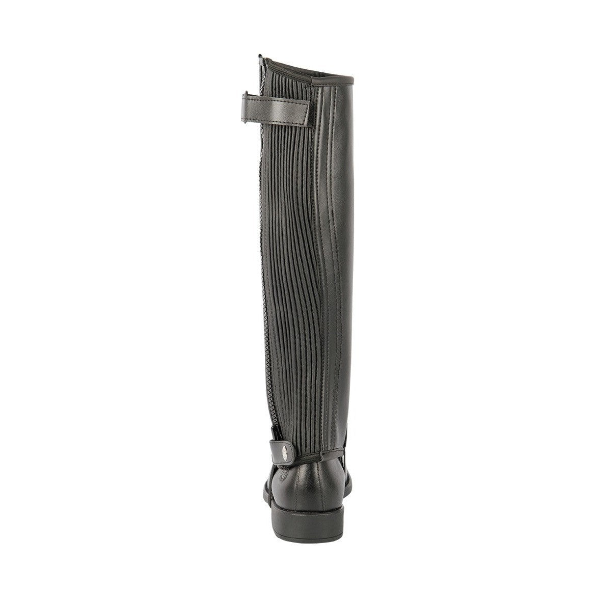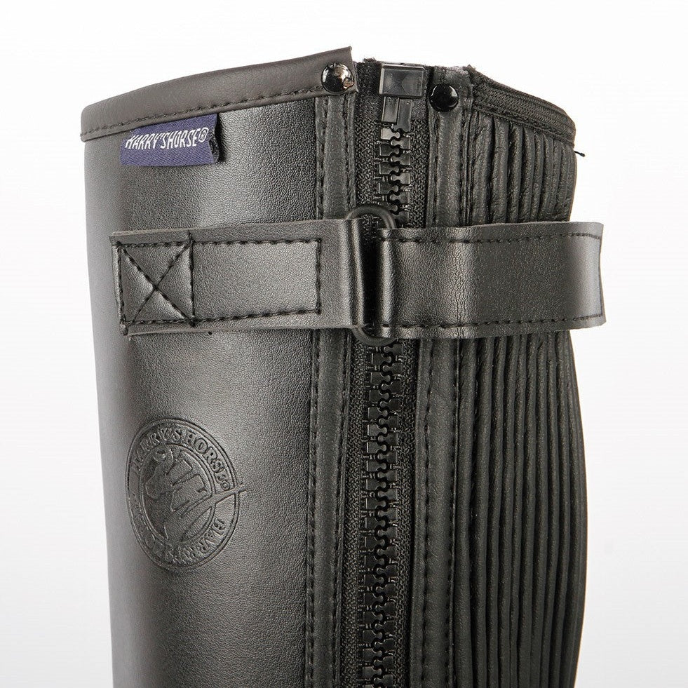 Mini-Chap mit elastischem Wadenteil und Reißverschluss an der Außenseite. Aus atmungsaktivem PU-Material.