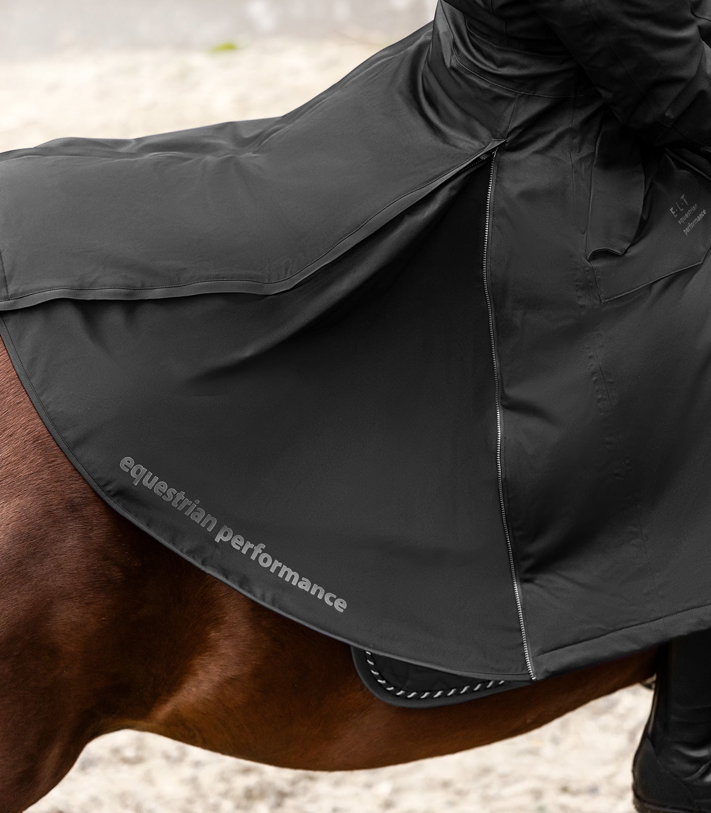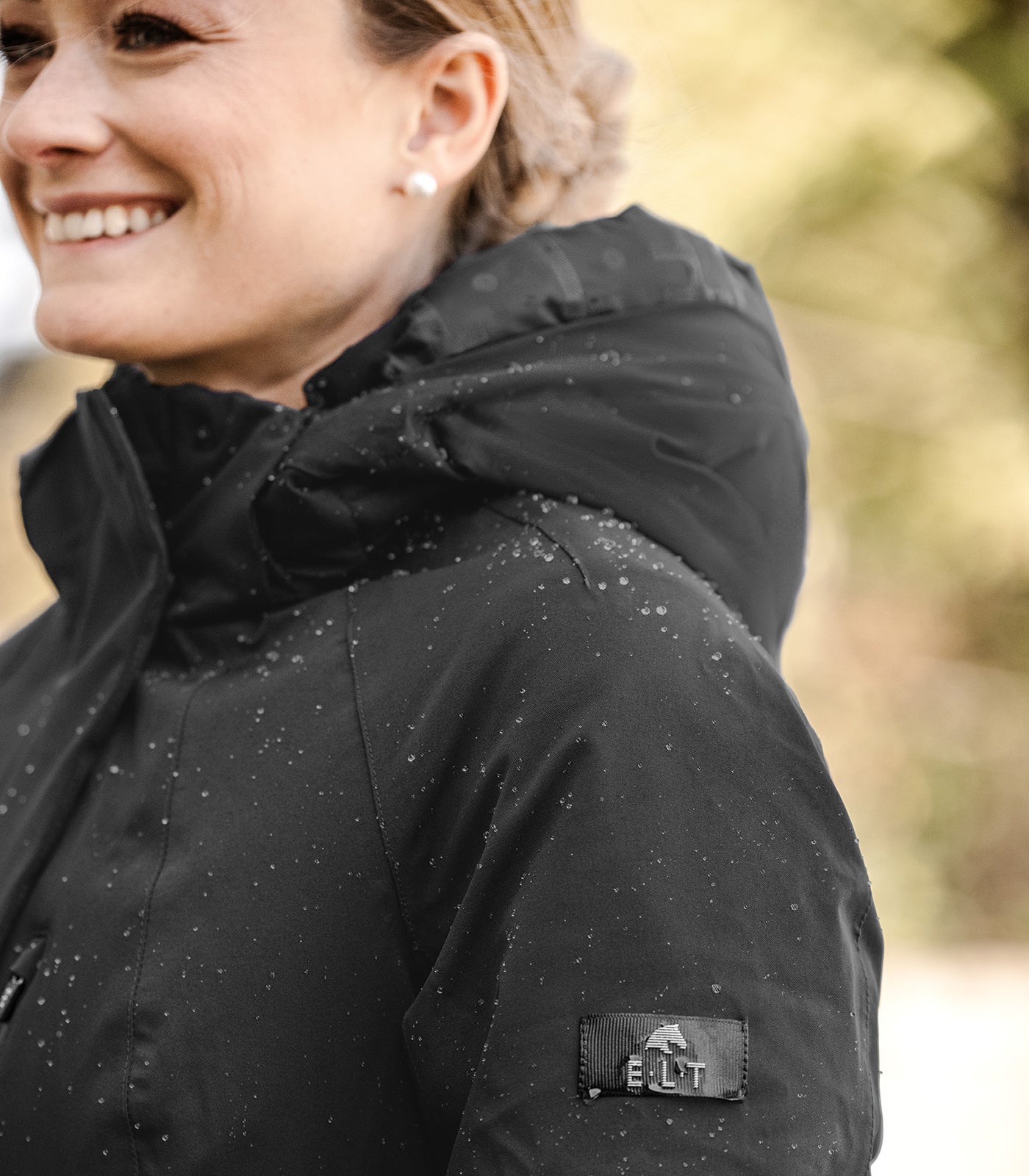 - Twee grote opgestikte zakken met drukknopen en handwarmende fleecevoering. Rechterzak met E·L·T Equestrian Performance-opschrift