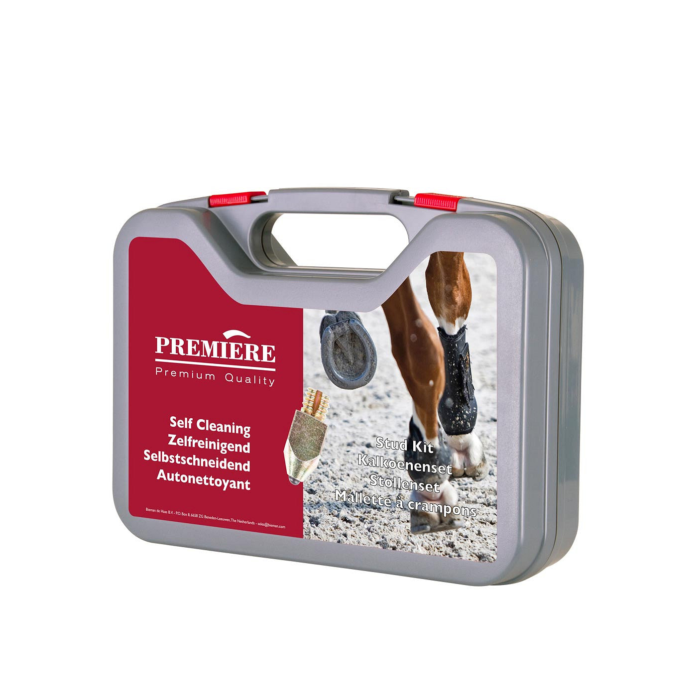 Complete zelfreinigende kalkoenenset in praktische opbergkoffer, bestaande uit 2 x 8 stalen kalkoenen (twee soorten), 8 pluggen, 10 rubberen dopjes, tap en sleutel in ŽŽn, inbussleutel en krabber met stalen borsteltje voor het schoonmaken van de kalkoengaten. Type schroefdraad: M12.