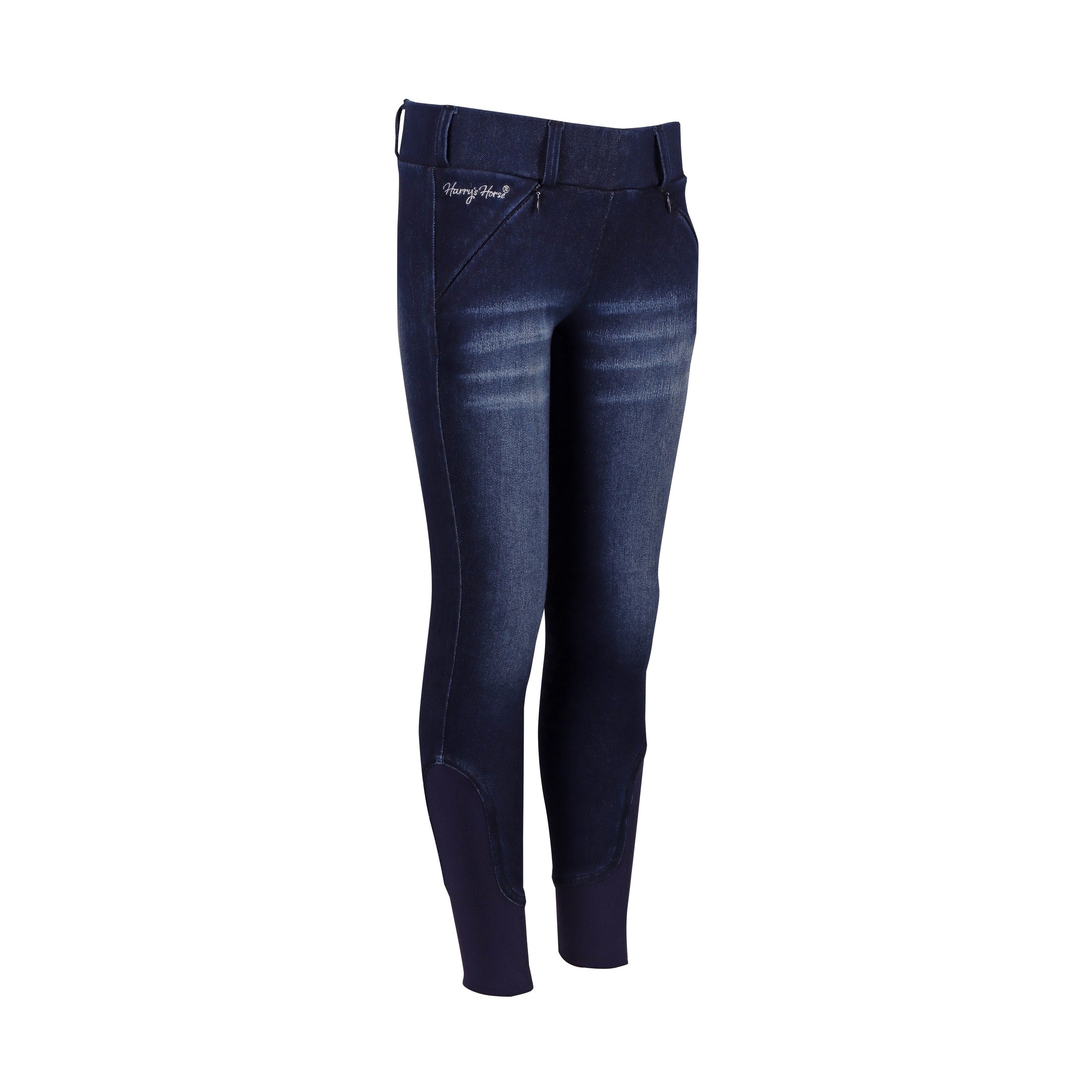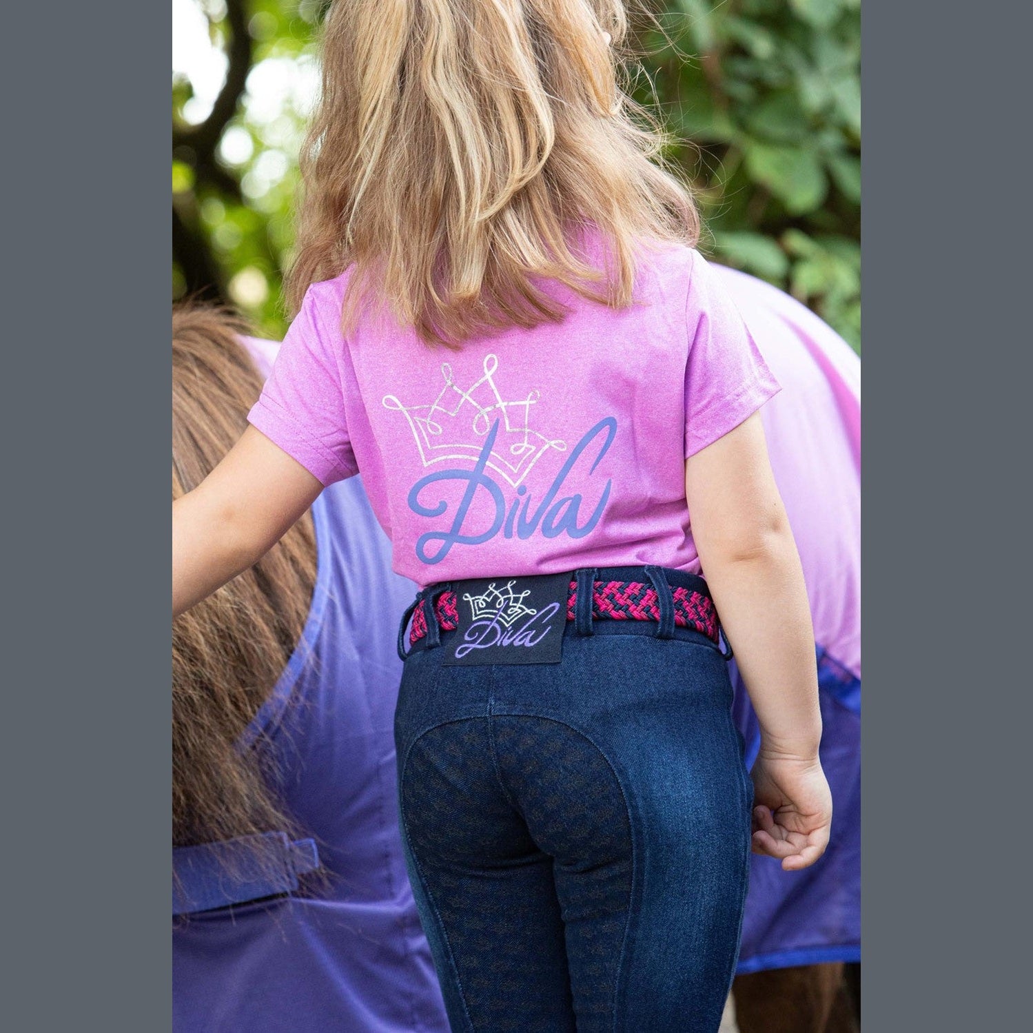 Legging d'équitation aspect denim avec un délavage amusant et des logos Diva, un badge sur la ceinture, des passants de ceinture, deux poches, un siège à coutures rondes avec un imprimé en silicone et un insert élastiqué autour de la cheville pour plus de confort dans vos bottes d'équitation.