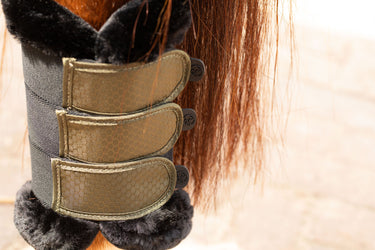 Protège-jambes avec fermeture élastique auto-agrippante. L'intérieur est doublé de maille pour une dissipation optimale de la chaleur et orné d'une bordure en fausse fourrure pour un aspect luxueux. Leur coupe ajustée offre au cheval une grande liberté de mouvement. Lavables en machine à 30 °C.