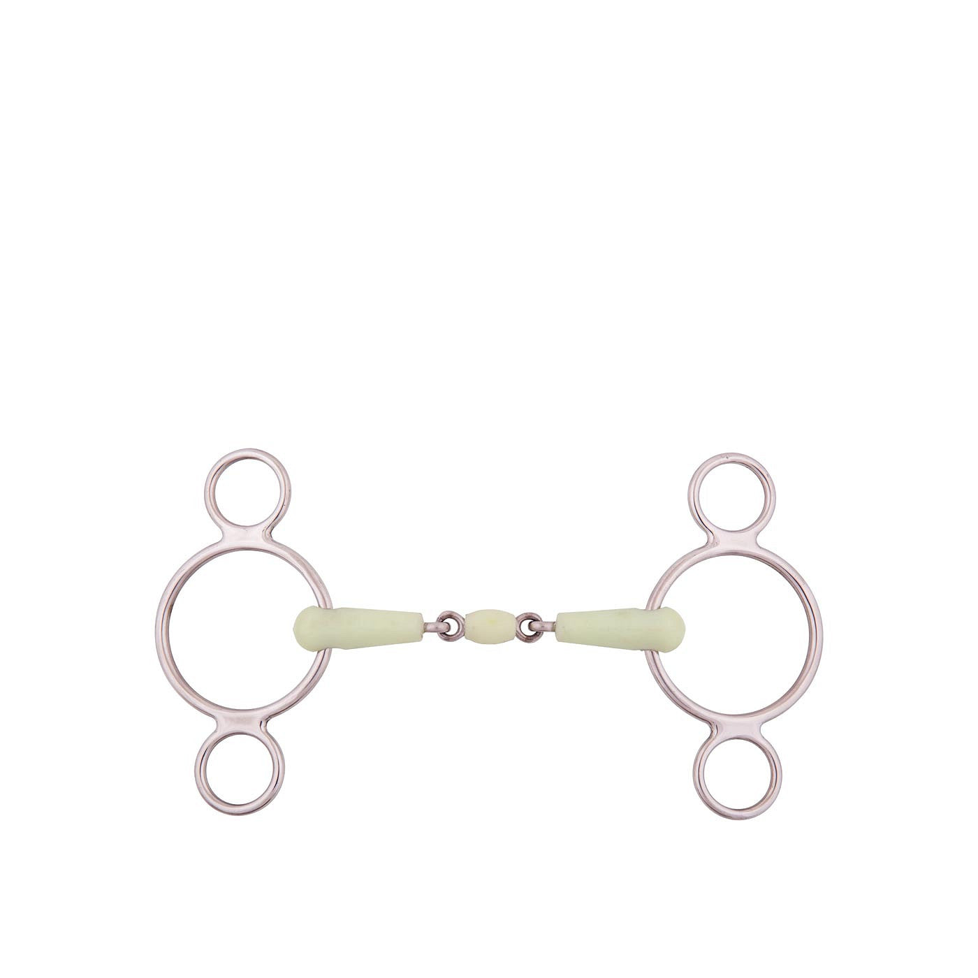 Filet Pessoa double brisure 3 anneaux avec mors Apple Mouth avec anneaux en acier inoxydable, anneaux 55 mm pour 11.5 cm et 65 mm pour 12.5 cm, 13.5 cm et 14.5 cm. Le mors a une épaisseur de 18 mm.