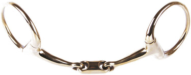 Dubbel gebroken bustrens met o-link, geheel uitgevoerd in GB (koperkleurig). Dikte mondstuk 13mm, doorsnee ringen 70mm.