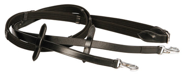 Teugels webband met lederen stops en nikkel gespen. Met clipsluitingen. Breedte tussen stops 14cm.