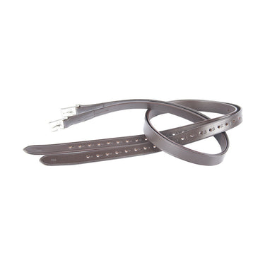 Lederen beugelriemen met zilverkleurige gespen. De beugelriemen zijn bij de buckles verstevigd met nylon.