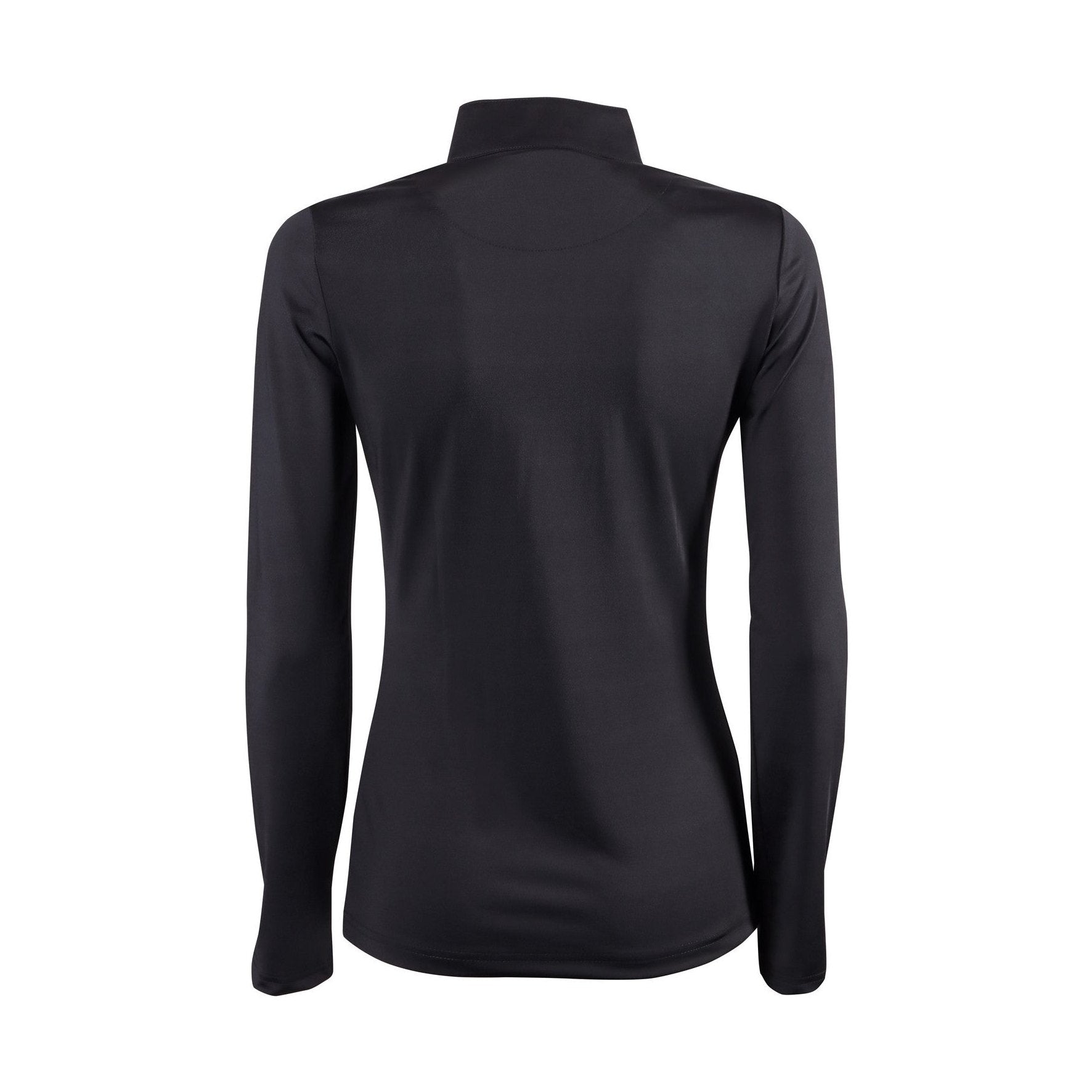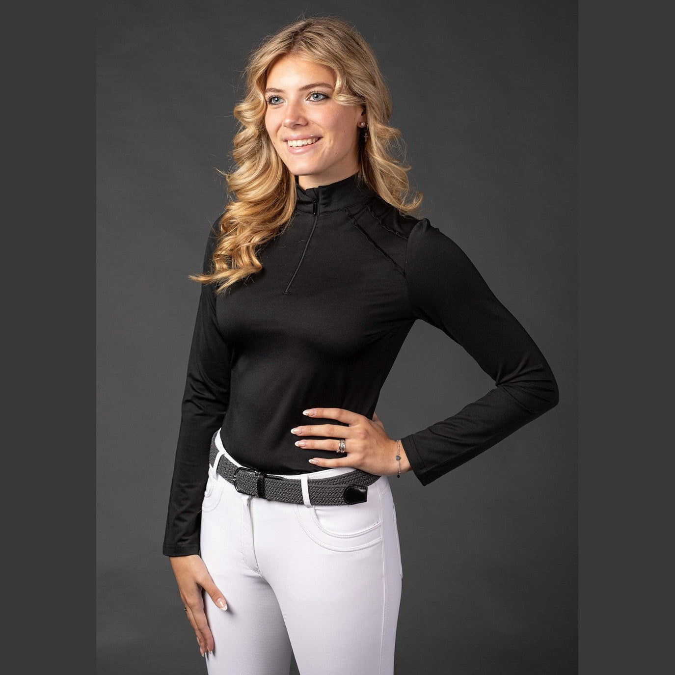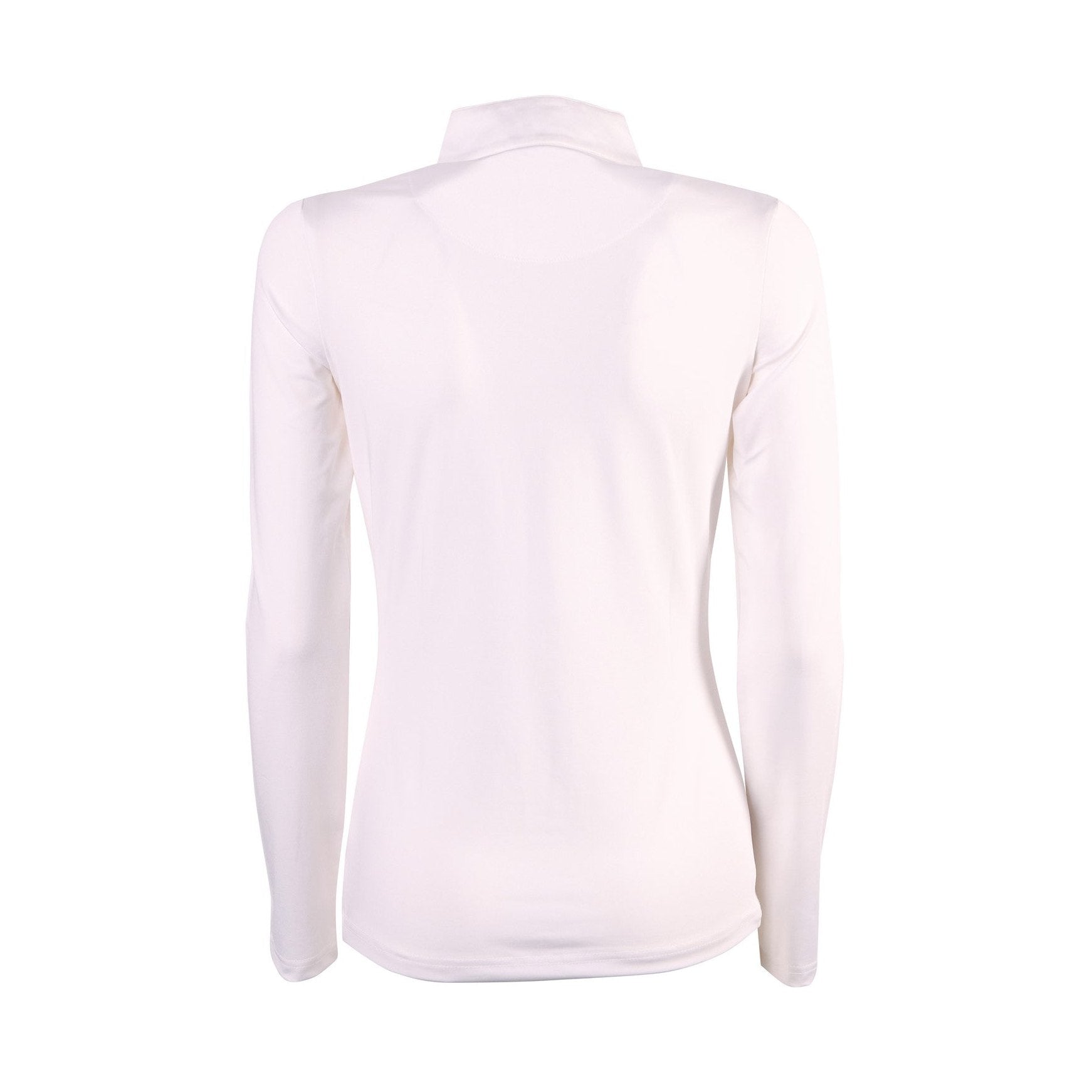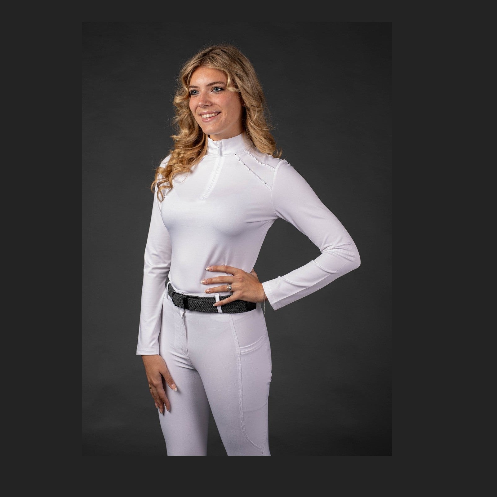 Wedstrijdshirt met lange mouw, opstaande kraag met korte ritssluiting en op de schouders een dubbele plooi versierd met kristallen.